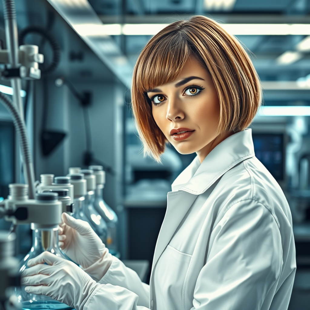 A confident woman scientist with a chic bob haircut and captivating hazel eyes is immersed in her work, wearing a pristine white lab coat. She is engaged in intricate experiments within a cutting-edge laboratory. Her half-body portrait, rendered in the signature detailed style reminiscent of the masterful Henri Rousseau, is set against a backdrop of sleek, futuristic equipment. The scene is expressive and lively, capturing her determination and the innovative spirit of the state-of-the-art environment.