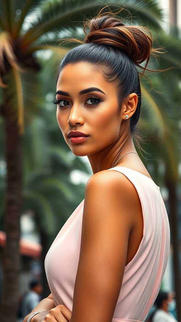 A confident woman stands facing the camera, her head slightly tilted and her gaze engaged and intense. Her high ponytail, with a few wisps gently caressing her face, emphasizes her strong features. Subtle makeup accentuates her expressive eyes and neatly shaped eyebrows. She is dressed in a chic summer dress of pastel hues, suitable for a professional setting. The background suggests a tropical cityscape, perhaps suggesting the bustling allure of Dubai or the vibrant energy of Taiwan, with exotic trees gently swaying in the humid breeze. The climate is unmistakably warm and sultry. Her complexion has a glowing, healthy appearance, thanks to the nourishing cosmetics she uses. Her skin tone carries the rich warmth of Middle Eastern heritage.