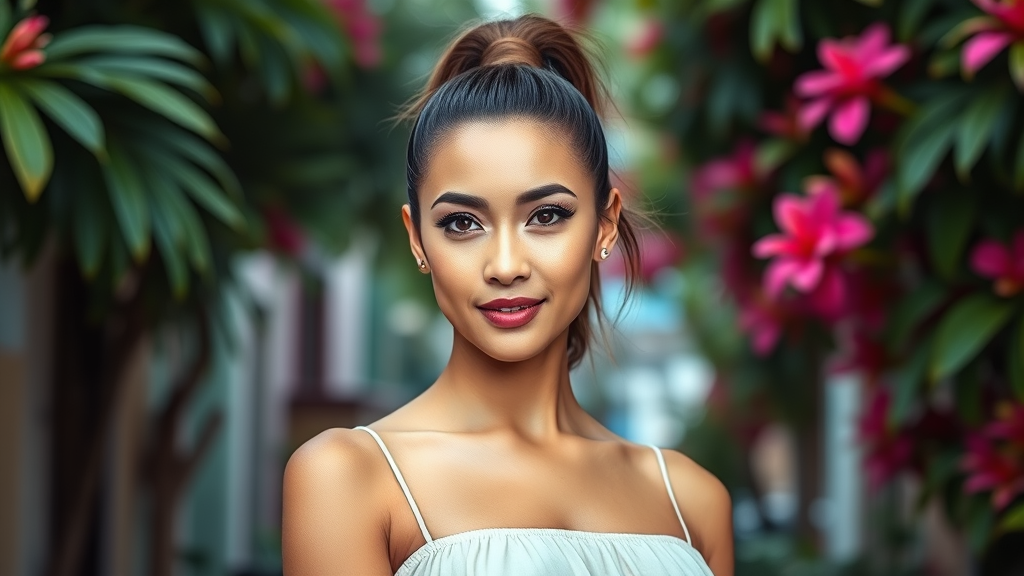 A confident woman stands poised, facing the camera with a slight tilt to her head, exuding a strong, captivating presence. Her deeply engaging eyes are emphasized with subtle makeup beneath finely arched eyebrows. Her sleek hair is styled into a high ponytail, with a few loose strands softly framing her radiant face, exhibiting a healthy glow. Dressed in a pastel-hued summer dress, she embodies both elegance and professionalism suitable for a warm day at work. The setting is a vibrant tropical city, reminiscent of Dubai or Taiwan, where exotic foliage thrives, hinting at the humid and hot climate. Her complexion, a warm Middle Eastern tone, is further enhanced by the use of rejuvenating skincare, giving her skin a youthful, luminous appearance.
