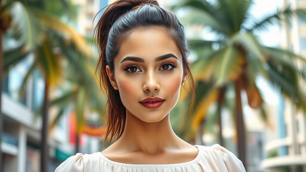 A confident woman stands straight, gazing directly into the camera with a captivating look, her head slightly tilted. Her hair is styled in a sleek high ponytail, with loose strands elegantly framing her face. Her makeup delicately accentuates her eyes beneath well-defined eyebrows, complementing her warm Middle Eastern complexion. She is dressed in a pastel-colored summer dress, suitable for work, exuding a sense of professional elegance. The background reveals a vibrant tropical city, hinting at locations like Dubai or Taiwan, with exotic palm trees swaying gently. The air feels hot and humid, emphasizing the bright and refreshed appearance of her skin, thanks to the use of nourishing cosmetics.