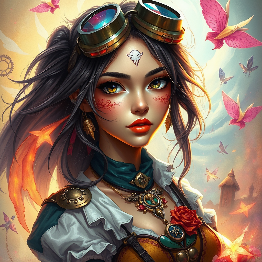 A confident woman with goggles resting on her head, surrounded by vibrant fantasy elements, in the style of Rudy Siswanto, realistic fantasy art, intricate details, vivid colors, ethereal atmosphere, whimsical attire adorned with mystical symbols, radiant light casting soft shadows, dynamic composition highlighting her adventurous spirit.