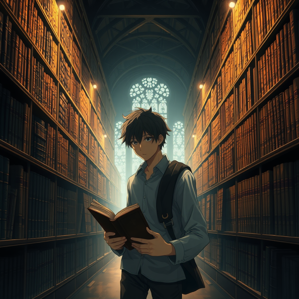A contemplative anime boy with an introverted demeanor wanders through the dimly lit aisles of an ancient library, his haven of solace within the hallowed halls of academia. The evening casts long shadows over the grand shelves stacked high with leather-bound volumes. Immersed in the world of dark academia, he loses himself in the pages of a weathered book, embodying the thoughtful and introspective nature of an INFJ.