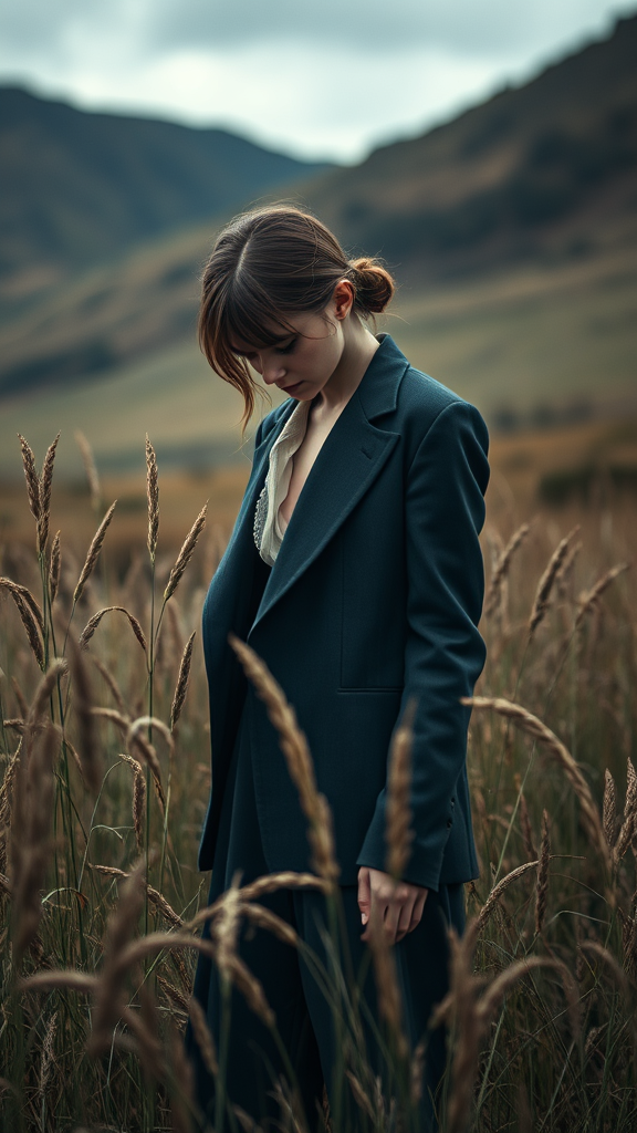 A contemplative figure stands amidst tall grass, head bowed, exuding a sense of mystery and introspection. The scene is set against the backdrop of dramatic Scottish landscapes, with hues of light bronze and deep blue painting the tranquil yet striking environment. The fashion is an artistic blend of deconstructed tailoring, embodying a fluid, genderless aesthetic that challenges traditional norms. The photography captures close-up shots, focusing on the intricate details of the fabric and the delicate interplay of colors. The overall mood is one of brooding elegance, inviting viewers to delve into the serene yet complex narrative woven into the visual tapestry.