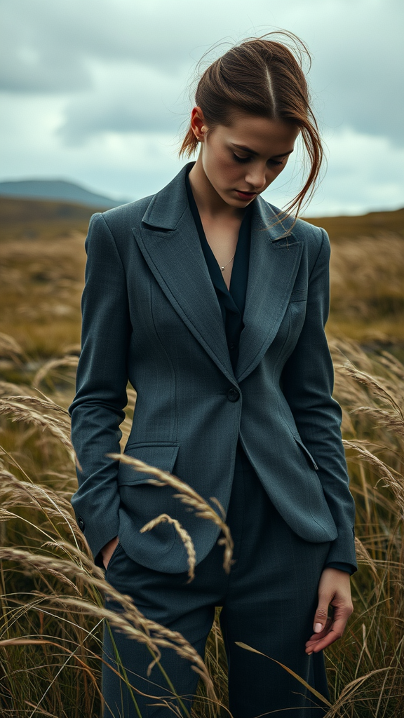 A contemplative figure stands amidst the lush, windswept grasses of the Scottish Highlands, their head slightly bowed, embodying a fusion of fashion and nature's raw beauty. The scene is captured in the style of high-end fashion photography, with a palette of light bronze and deep, moody blue hues dominating the composition. The attire features deconstructed tailoring that challenges traditional norms, reflecting a genderless aesthetic. The close-up shots emphasize the intricate textures of the fabric and the subtle interplay of shadow and light, infusing the image with a brooding and introspective mood.
