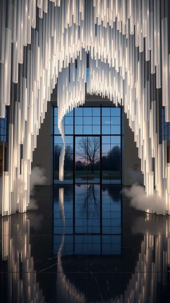A contemporary art gallery entrance featuring cascading light sculptures and a minimalist, curved light installation creating a tunnel effect with a cinematic mood. The space is designed with perfect symmetry and ultra-sharp details, captured with a medium format camera. Dramatic side lighting enhances the reflective black marble flooring, creating an ethereal atmosphere with subtle fog elements. The geometric glass grid pattern of the structure adds to its allure, set against a twilight ambiance. The scene is rendered in photorealism with rich detailing, offering a captivating visual experience.