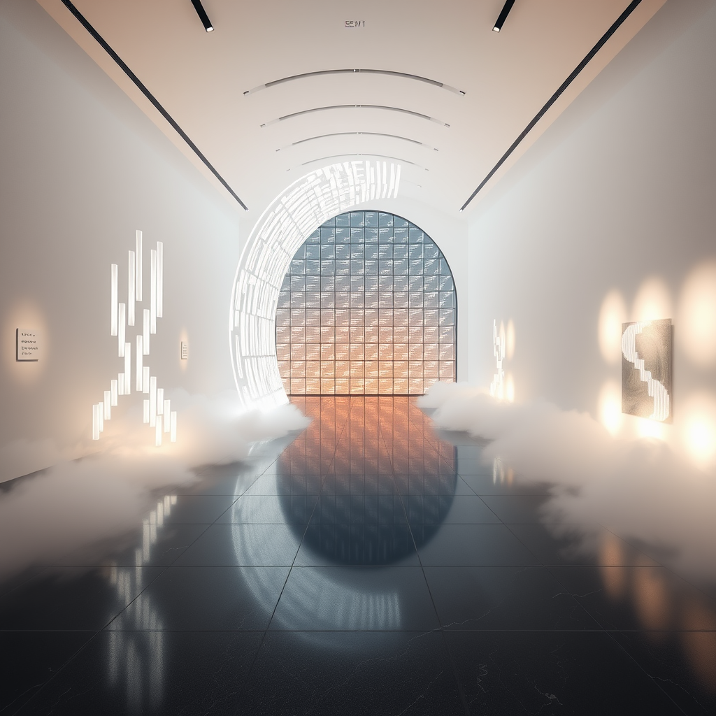 A contemporary art gallery entrance featuring cascading light sculptures leads into a minimalist curved light installation creating a tunnel effect. It presents a cinematic mood with perfect symmetry and ultra-sharp details captured through a medium format camera. Dramatic side lighting enhances reflective black granite flooring, contributing to an ethereal atmosphere enriched by subtle fog elements. The scene includes a geometric glass grid pattern illuminated under a twilight ambiance, with photorealistic attention to rich details. The environment is creatively interspersed with interactive light patterns that dance across the walls, hinting at a future-forward aesthetic.