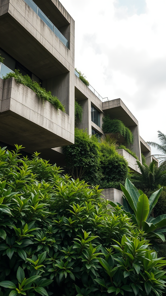 A contemporary, brutalist-inspired residential building enveloped by vibrant plant life features raw, exposed concrete with expansive, rectangular, and cantilevered elements. The concrete sections boast precise, clean lines and alternating depths, accentuating the sense of volume and structure. Lush vegetation is seamlessly integrated into the design, cascading over the concrete edges, merging the natural with the stark, industrial style. This scene is captured with a full-frame camera utilizing a wide-angle lens to span the structure and its verdant surroundings, preserving a sense of depth and grandeur. The lens is set to a narrow aperture to achieve a profound depth of field, ensuring sharp focus on both the architecture and the foreground foliage. The composition is harmonious and symmetrical, with the building centered in the frame. It spans the midsection of the image, with flourishing greenery at the base and an overcast sky above, creating a harmonized, stratified visual. The diffused lighting from the cloud cover softens shadows, enhances the concrete's texture, and maintains a brooding ambiance. Subtle reflections on the moist pavement in the foreground add texture and ground the image.