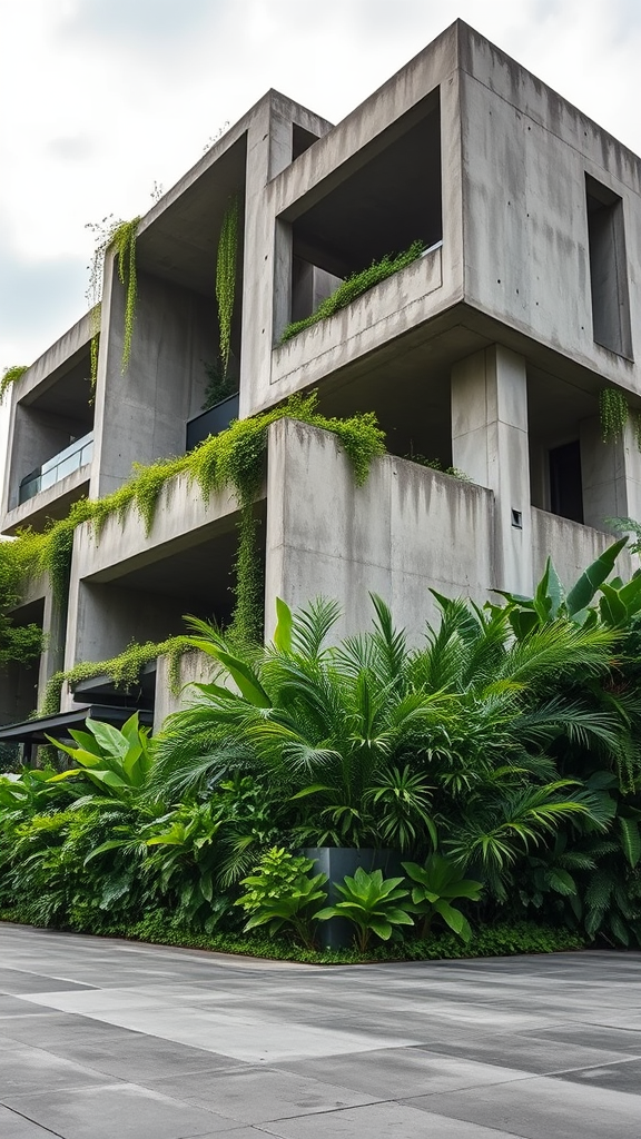 A contemporary, brutalist-style residential building surrounded by abundant greenery. The structure is made of raw, exposed concrete with large, rectangular slabs and cantilevered sections. Each slab features sharp, well-defined lines and varying depths, adding to the sense of depth and form. The design incorporates plants, with greenery cascading over the concrete edges, merging natural elements with the industrial aesthetic. Captured using a full-frame DSLR or mirrorless camera with a wide-angle lens, the scene captures the complete breadth of the building and its lush landscape, while preserving depth and scale. A small aperture is used to achieve a deep depth of field, ensuring clarity for both the building and the foreground foliage. The composition is meticulously balanced, with the building centrally positioned in the frame. Its horizontal alignment dominates the middle of the image, the greenery spreads across the bottom, while the cloudy sky occupies the top, creating a well-layered visual effect. Soft, diffused light from the overcast sky highlights the concrete texture and maintains a moody atmosphere. The glossy pavement in the foreground lightly reflects light, adding texture and anchoring the scene.