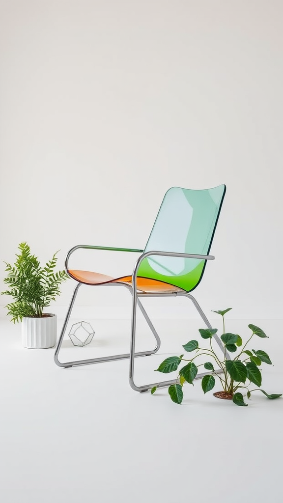 A contemporary chair design set in a minimalist studio, captured through a 90mm lens, showcasing a sleek steel frame complemented by vibrant colored glass elements; surrounding the chair are a few lush green plants and a subtle geometric object adding depth to the composition.