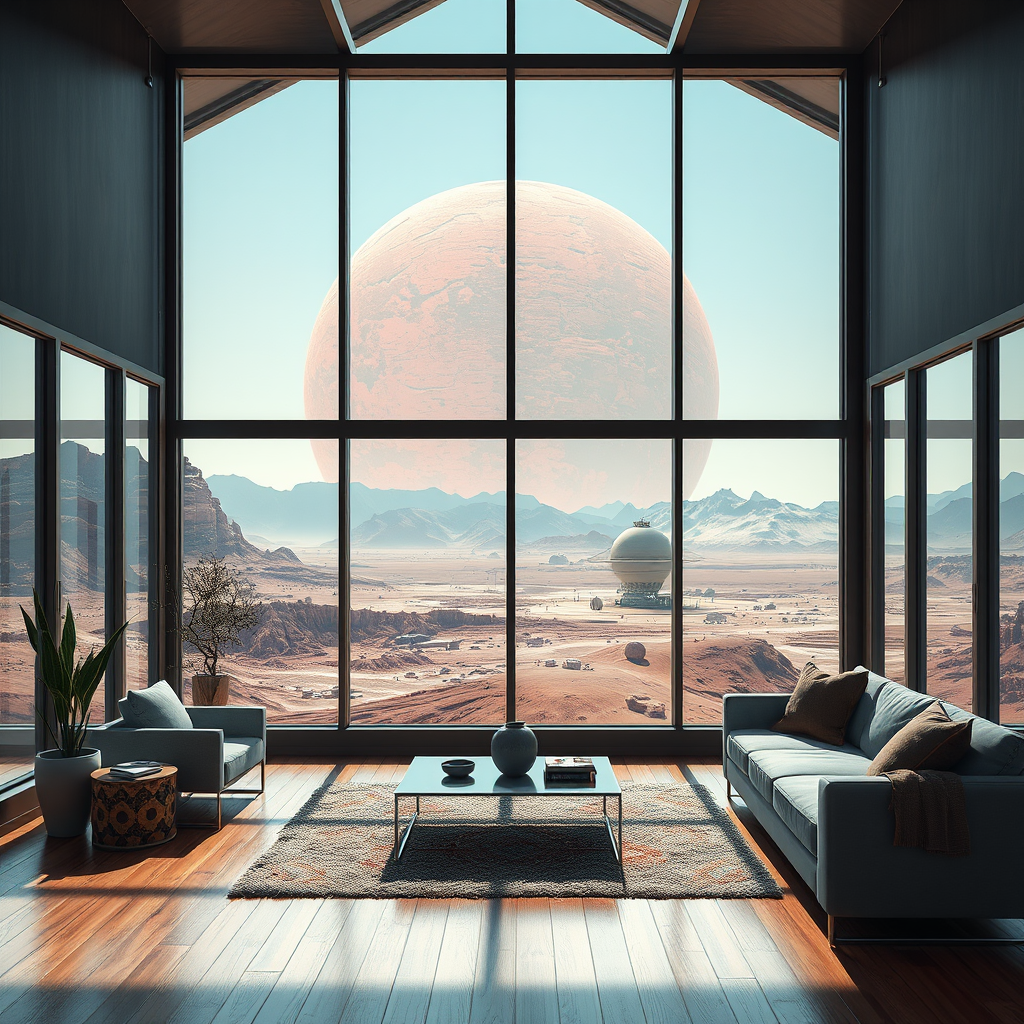 A contemporary living room with large windows revealing a breathtaking view of the Martian landscape outside, blending fantasy elements with digital art. The scene captures high quality and high resolution with intricate details, akin to a portfolio piece by Bryan Organ, featuring a matte finish. Inspired by the trending styles on ArtStation, reminiscent of Greg Rutkowski's work, minus any negative connotations or inappropriate content.