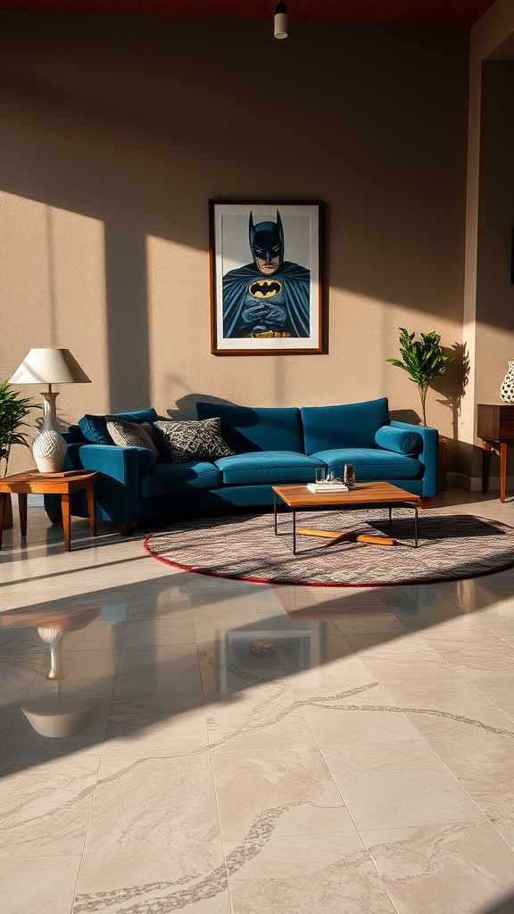 A contemporary lounge captured in a photograph during the morning, showcasing polished tile flooring adorned with a stylish rug, featuring a framed illustration of Batman on the wall. The room includes a deep blue sofa set paired with a sleek wood side table. Bathed in natural light, the composition offers an ultra-high-definition view with a sense of serene chaos, maintaining a vertical 9:16 aspect ratio and a raw, unfiltered style.
