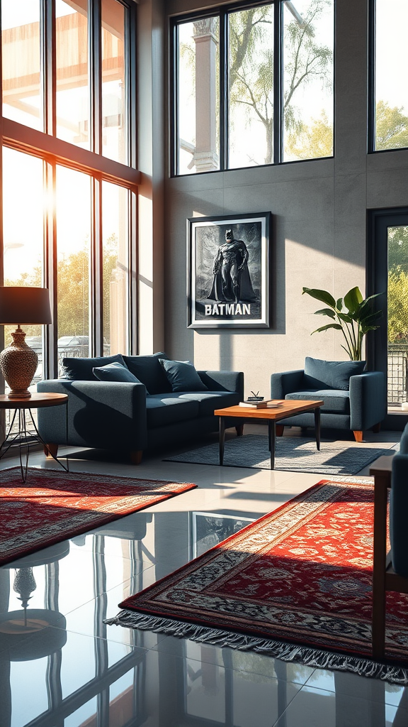 A contemporary lounge lit by the soft glow of morning light filters through large windows, showcasing a glistening polished tile floor. A plush, dark blue sofa set invites relaxation, complemented by an elegant wood side table. The room's centerpiece is a striking Batman illustration art frame, adding a touch of bold character. Rich-textured rugs anchor the space, while natural light highlights the room's raw beauty in ultra-high definition, creating an atmosphere of modern sophistication.