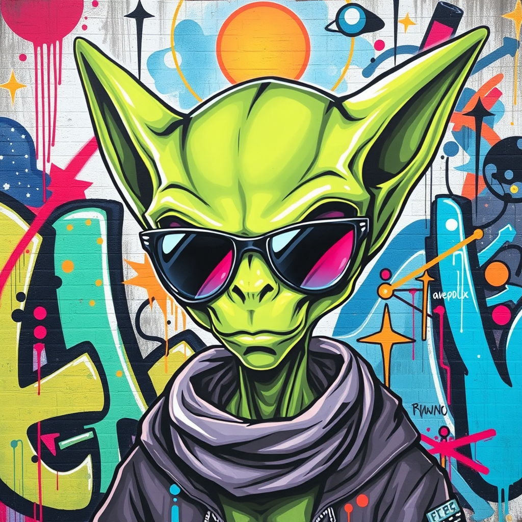A cool depiction of a wise, green alien with pointy ears, wearing sleek sunglasses, surrounded by vibrant, urban graffiti that mixes colorful abstract shapes and cosmic elements, blending modern street art with a touch of sci-fi mystique.