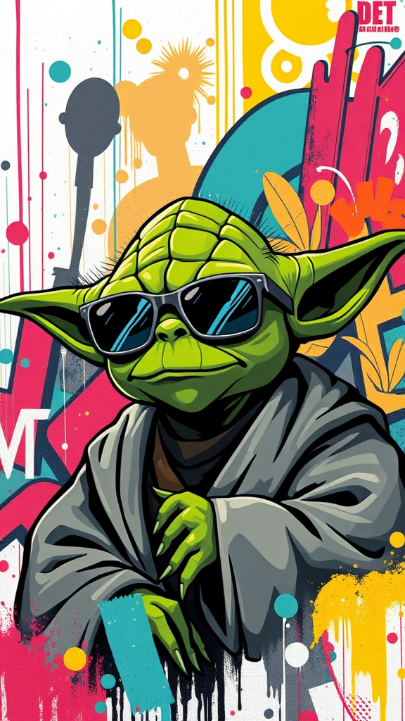 A cool Yoda wearing sleek sunglasses, immersed in a vibrant graffiti-styled scene, surrounded by colorful abstract shapes and bold street art elements, a playful and urban twist on the wise Jedi master.