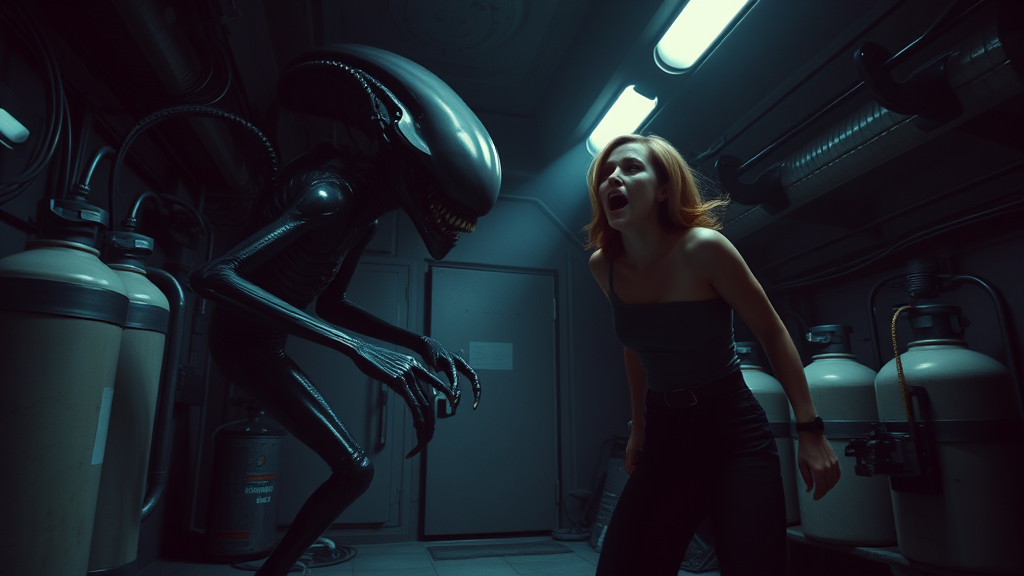 A copy of the movie "ALIEN" in Ridley Scott's style, featuring an alien poised menacingly while Ellen Ripley, portrayed by Sigourney Weaver, stands courageously screaming, trying to escape its clutches. They are surrounded by industrial equipment like oxygen tanks within a dimly lit, shadowy room. The shot is wide, capturing the raw tension, taken in the style reminiscent of a Sony ALPHA 7R V. The scene has a filmic quality and dramatic, cinematic lighting, enhancing the suspenseful atmosphere.