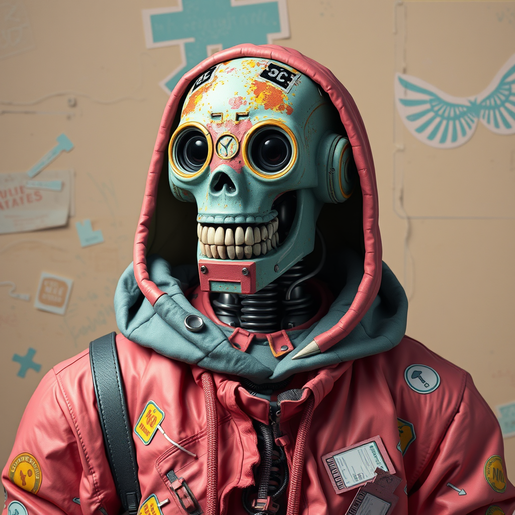 A corroded robot in a ruffled hoodie, rendered in vibrant pastels, portrayed in a classic cubist-influenced still life composition, similar to the works of Jean-Michel Basquiat, behance OC winner, neo-expressionist, 3D figurative concept, he is shrouded in wallets, coated in lollipops body, cthulhu fortnite skin, incredulous gap-toothed Greek god head, portrait of patent man, high detail portrait, sticker artwork, binders, full body shot ultra-detailed --s 500 --ar 2:3 --q 2.