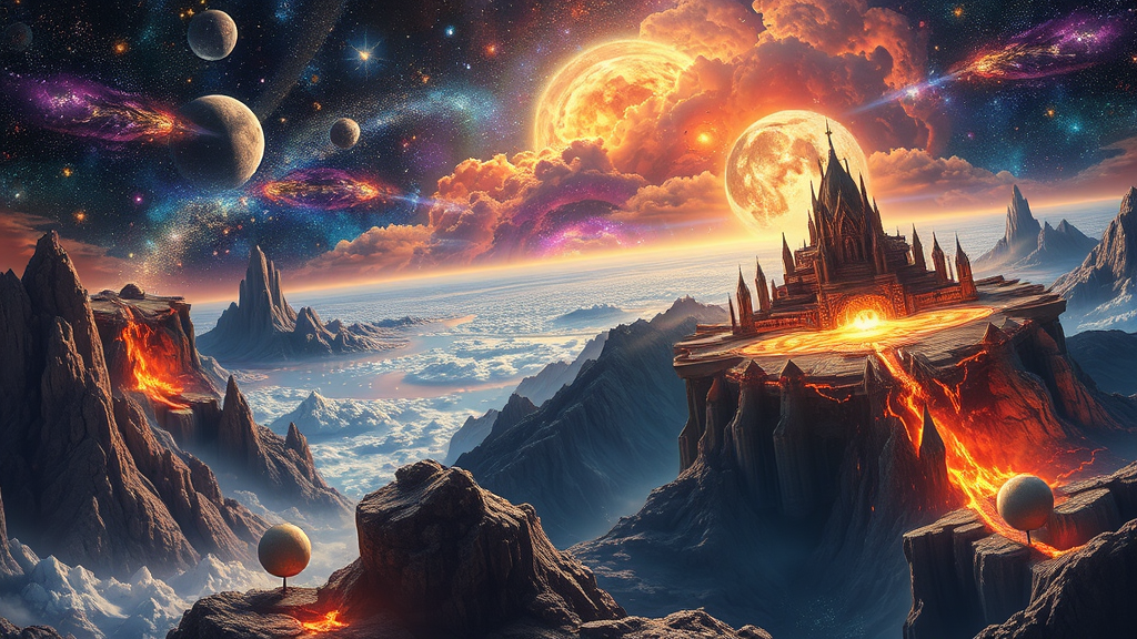 A cosmic dual-realm panorama featuring a hidden dimension within a vast universe, intricately detailed fantasy worlds viewed from celestial heights, ethereal heaven juxtaposed with an infernal realm, each enriching the cosmic tapestry with unique landscapes and luminous details.