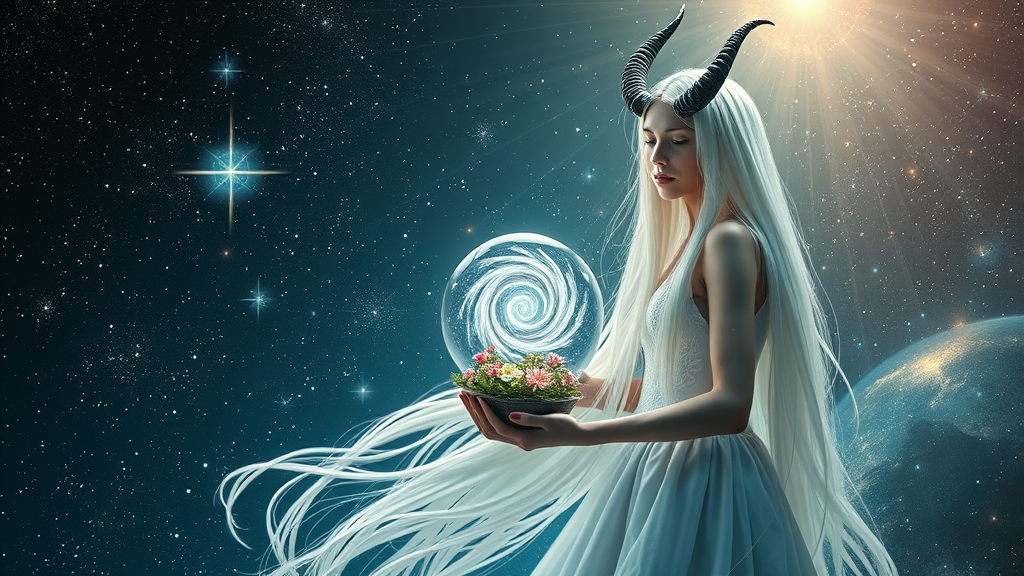A cosmic girl with elegant horns and flowing long white hair stands amidst a stunning celestial landscape filled with countless stars. She holds a glass orb containing a swirling singularity surrounded by delicate flowers. The scene is captured in hyperrealistic detail, with photorealistic sharp focus, ensuring every nuance glows in 4k quality. The girl's ethereal presence and the cosmic beauty around her create a mesmerizing, dreamlike atmosphere.
