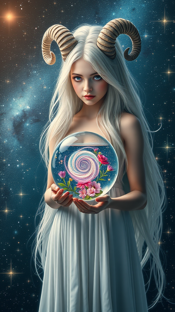 A cosmic girl with elegant, spiraling horns and flowing long white hair stands amidst a celestial landscape filled with countless twinkling stars. In her hand, she holds a gleaming glass orb that contains a swirling singularity surrounded by vibrant, ethereal flowers. Her eyes mirror the universe's depths, while her form is bathed in starlight, casting subtle shadows on her serene face. The scene is hyperrealistic with photorealistic textures, capturing every intricate detail in sharp focus, rendered in stunning 4K, showcasing both her ethereal beauty and the cosmic wonder surrounding her.