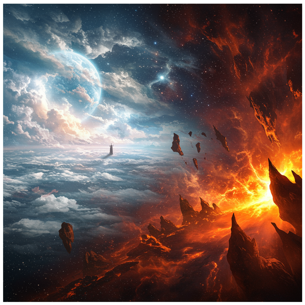 A cosmic landscape where paradisiacal realms intertwine with infernal domains, depicting two contrasting worlds within a single expansive universe, captured from a celestial viewpoint showcasing intricate details of ethereal skies, fiery abysses, and the harmonious balance between them.