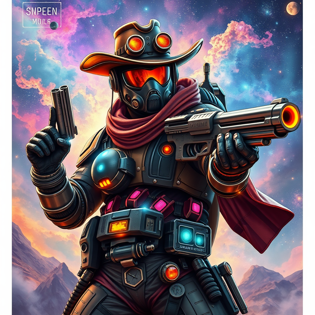 A cosmic lawman navigating the futuristic wild west, clad in intricate space-bounty hunter armor, wielding a sleek plasma revolver and sporting advanced cybernetic enhancements. Equipped with high-tech gadgets, their attire is vividly colored, reflecting the radiant hues of the cosmic frontier. This sci-fi western mashup merges steampunk and cyberpunk aesthetics against a backdrop of breathtaking nebulas. Illustrated with expert precision, the scene brims with detailed textures, glowing elements, and a dynamic composition, capturing an epic atmosphere. This captivating space opera, crossing genres with ultra-realistic, 4k Neo-Noir styling, showcases a universe where technology and tradition intertwine.