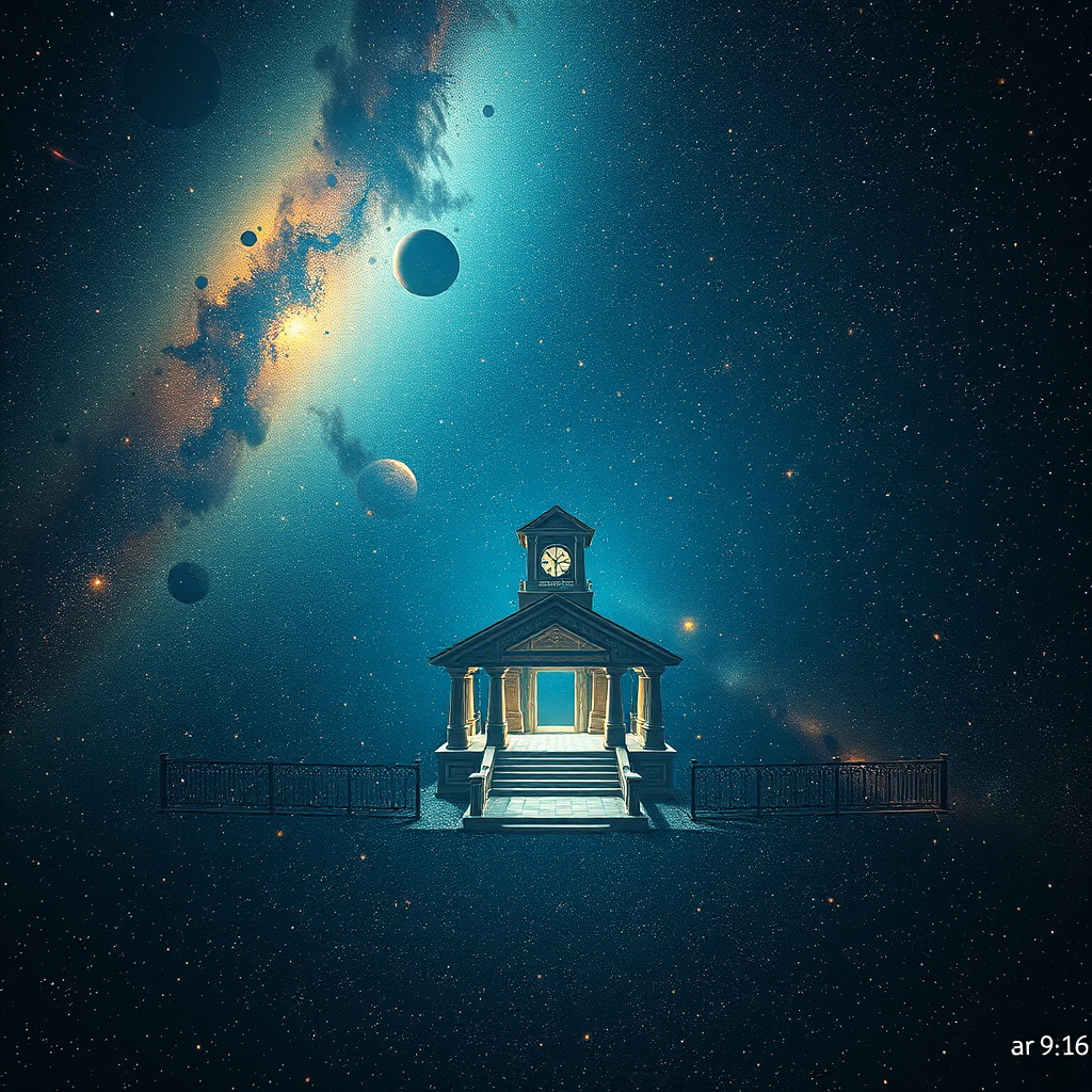 A cosmic sanctuary enveloped by the vast tapestry of glittering stars, stretching into the infinite expanse of the universe, each celestial body a radiant gem adorning the galactic temple—ar 9:16