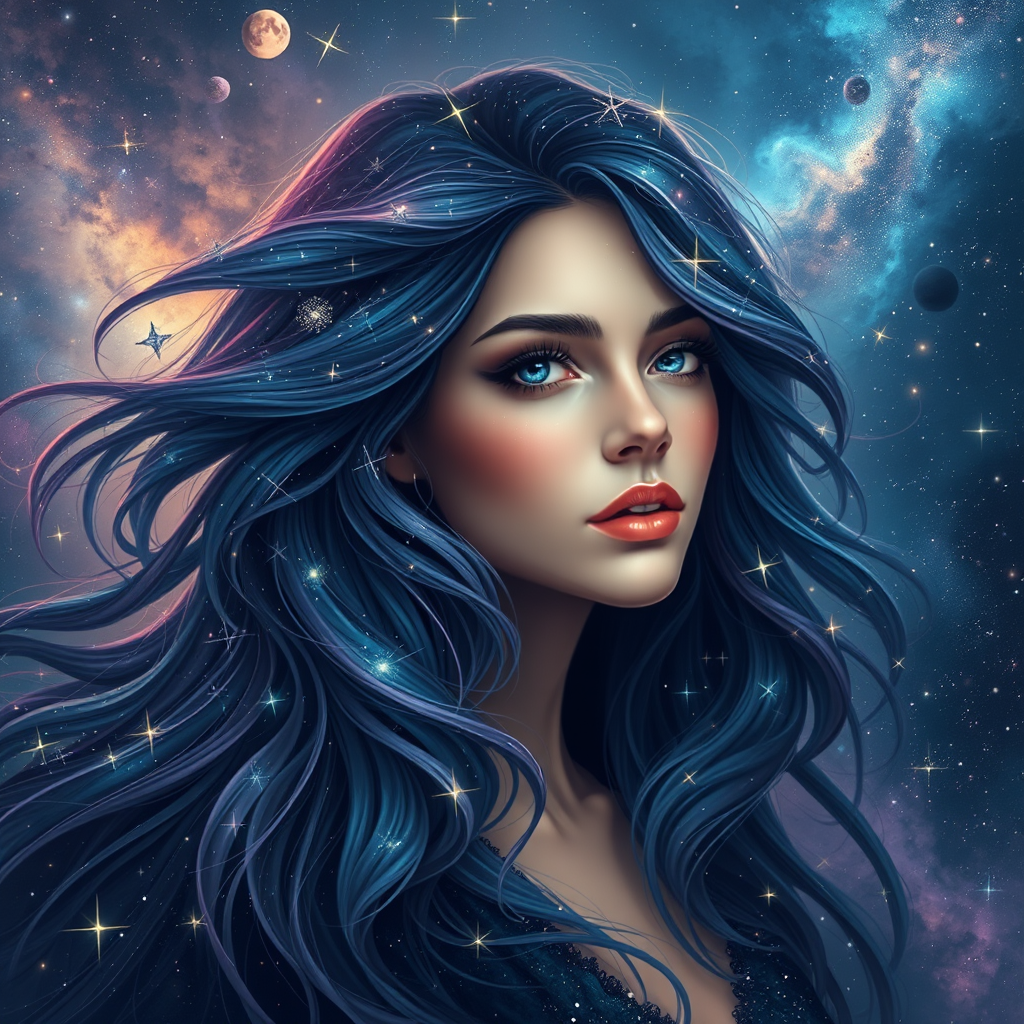 A cosmic woman with a flowing mane of shimmering stars and swirling nebulae, her hair a vibrant tapestry of deep blues and purples, punctuated by sparkling constellations that seem to dance across the night sky, her eyes reflecting the mysteries of the universe.