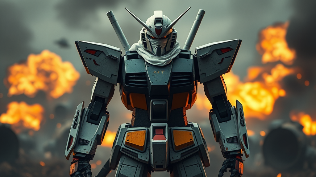 A counter-terrorist mecha inspired by Gundam, its face obscured by a white sheet with eye holes, stands poised amidst a chaotic warzone backdrop filled with fiery explosions. The scene captures a cinematic, realistic essence with a detailed focus on the mecha's design, reminiscent of the RX-78 model, embodying both grace and power.