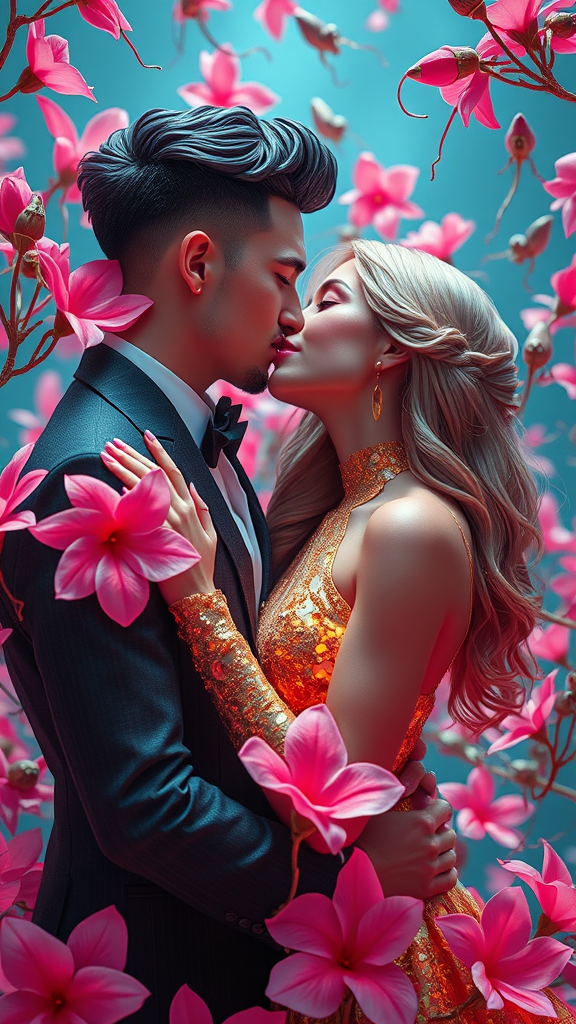 A couple embraces in a passionate kiss, surrounded by vibrant pink flowers that seem to pulse with life, set against a backdrop of cyberpunk futurism. Their forms are highlighted in shimmering gold and azure hues, merging seamlessly with an array of otherworldly creatures that float gracefully around them. The scene feels almost sculptural, as if crafted with exquisite detail from zbrush, and bursts with fantastical elegance. Their expressions capture an ethereal beauty that's almost unbelievable, accented by dark cyan shadows and striking red highlights. The image conveys intimacy within the vast expanse of this futuristic realm, resembling intricate portrait miniatures that captivate the viewer's imagination.
