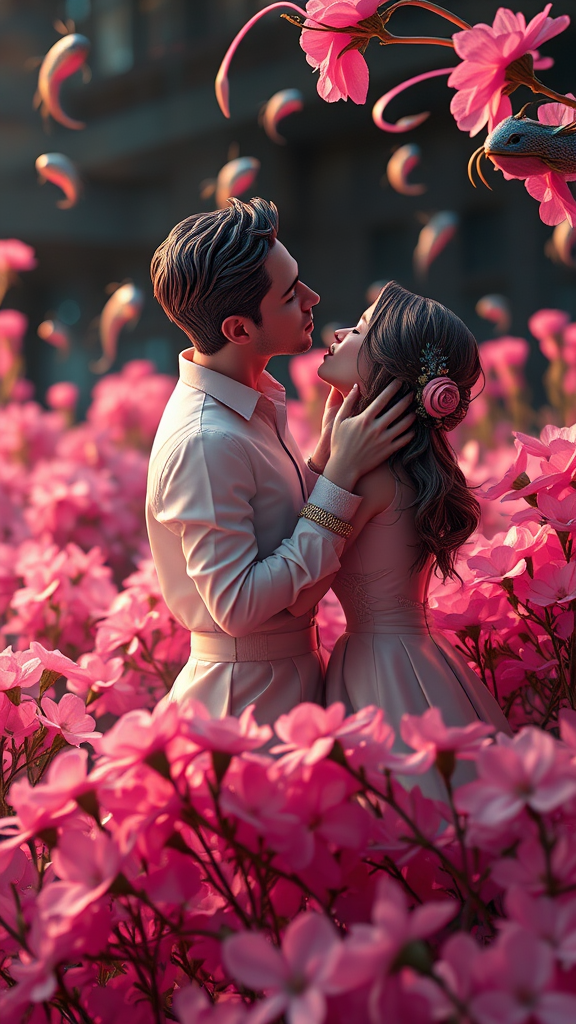 A couple embracing and sharing a kiss amidst a bed of vibrant pink flowers, in the style of cyberpunk futurism, adorned with hints of gold and azure. The scene features intricate zbrush artistry, infused with fantastical, otherworldly creatures weaving in the background. The couple is rendered as exquisite portrait miniatures, evoking a sense of awe and wonder, with an emphasis on dark cyan and rich red hues accentuating the breathtaking atmosphere. The entire composition elicits an incredible sense of beauty, blending the surreal with the futuristic.