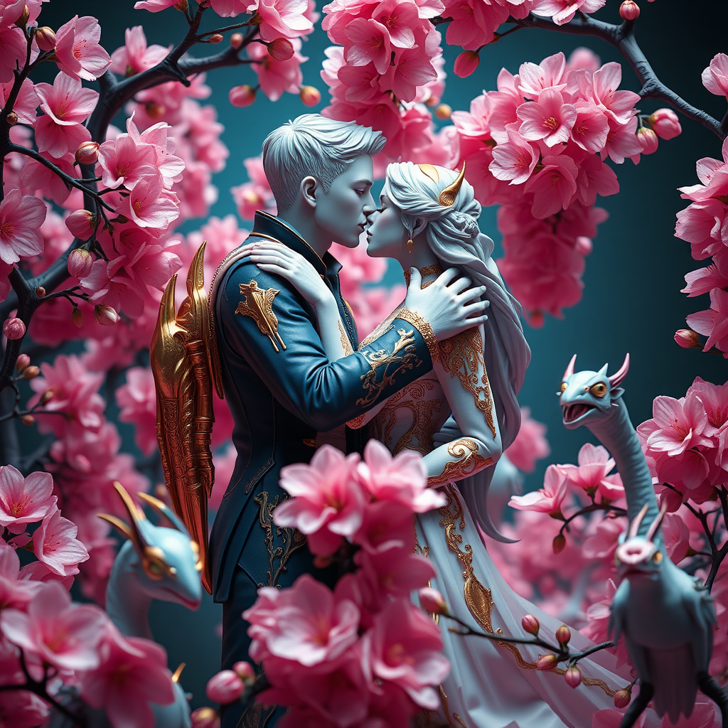 A couple embracing and sharing a kiss amidst vibrant pink blossoms, infused with the essence of cyberpunk futurism, adorned in shimmering gold and azure hues. Sculpted with the intricacy of zbrush, surrounded by fantastical, otherworldly creatures. A breathtaking composition akin to portrait miniatures, evoking awe with its stunning beauty. The scene is enhanced by rich shades of dark cyan and crimson, creating a mesmerizing contrast.