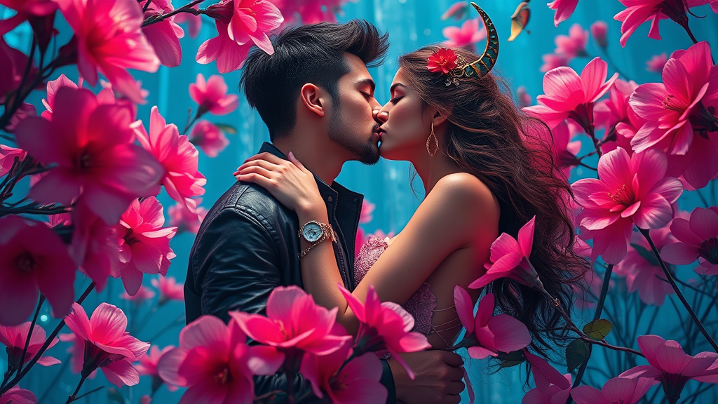 A couple embracing and sharing a kiss surrounded by vibrant pink flowers, depicted in a cyberpunk futurism style with accents of gold and azure. The scene features fantastical, otherworldly creatures, rendered in intricate detail reminiscent of portrait miniatures. The atmosphere is captivating and otherworldly, leaving one in awe of its beauty. The color palette blends dark cyan with striking reds, creating an enchanting and vivid depiction.