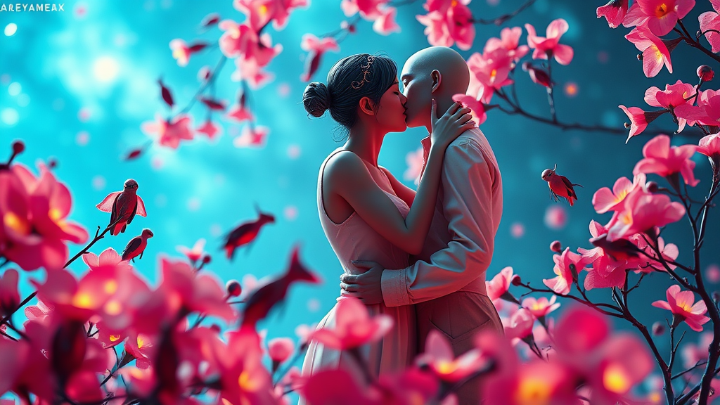 A couple embracing and sharing a tender kiss amidst a cascade of luminous pink flowers, set in a cyberpunk future world shimmering with hues of gold and azure. Sculpted with the intricate detail of zbrush artistry, the scene is alive with fantastical, otherworldly creatures weaving through the frame. This breathtaking portrait miniature blends dark cyan with striking red accents, capturing a moment of ethereal beauty and otherworldly charm.
