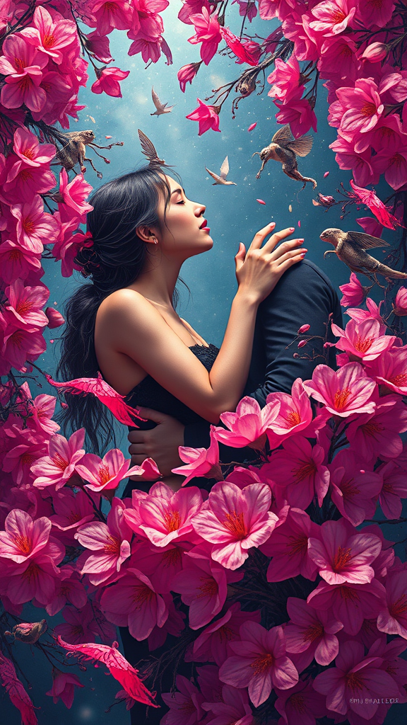 A couple embracing and sharing a tender kiss amidst a cascade of vibrant pink flowers, set against a backdrop of cyberpunk futurism, with shimmering accents of gold and azure. The scene is teeming with fantastical, otherworldly creatures weaving through the intricate designs, reminiscent of exquisite portrait miniatures. The composition exudes an overwhelming beauty, enveloped in deep hues of dark cyan and crimson.