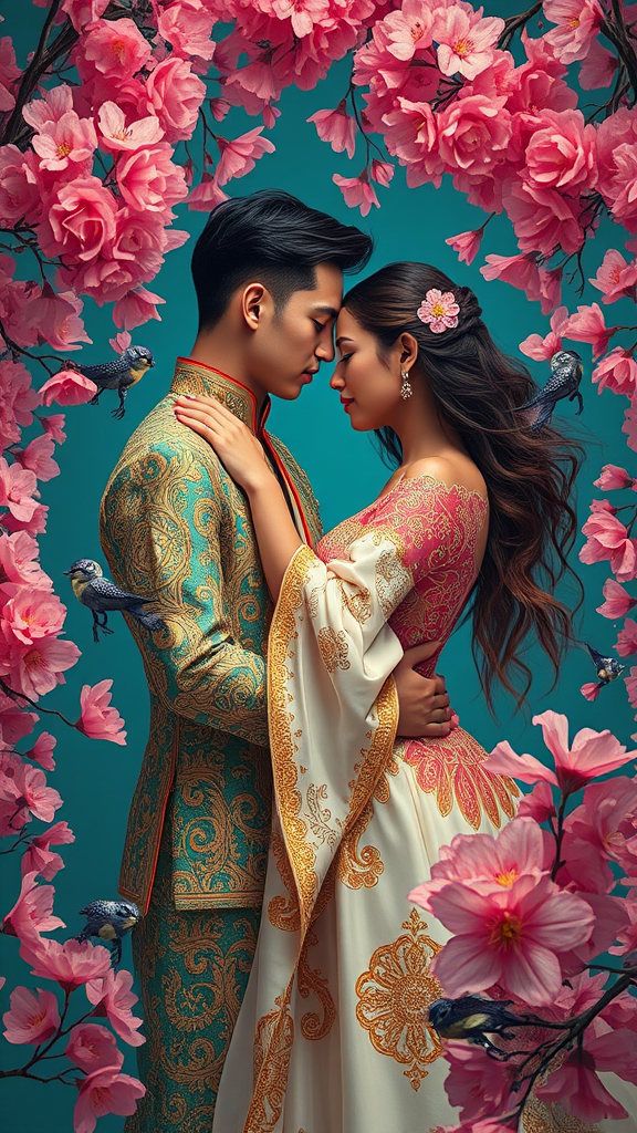 A couple embracing passionately amidst a cascade of pink blossoms, set against a backdrop of cyberpunk futurism. Their attire glows with intricate gold and azure patterns, as fantastical otherworldly creatures frolic around them. The scene is reminiscent of exquisite portrait miniatures, evoking a sense of awe and beauty. Rich contrasts of dark cyan and crimson red illuminate the surroundings, enhancing the ethereal atmosphere. The overall composition is breathtakingly stunning, blending the whimsical with the futuristic.