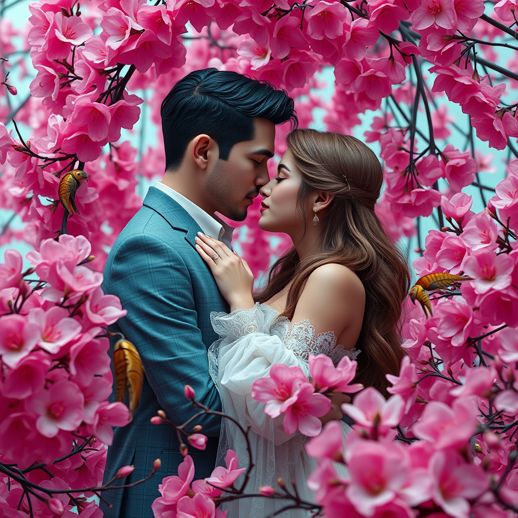 A couple embracing passionately amidst a cascade of vivid pink blossoms, rendered in a cyberpunk futurism style. Gold and azure hues intertwine with fantastical, otherworldly creatures gracing the scene. The composition echoes the intricate details of zbrush and the charm of portrait miniatures, evoking an overwhelming sense of beauty. The palette is enriched with dark cyan and deep red, creating a mesmerizing and otherworldly atmosphere.