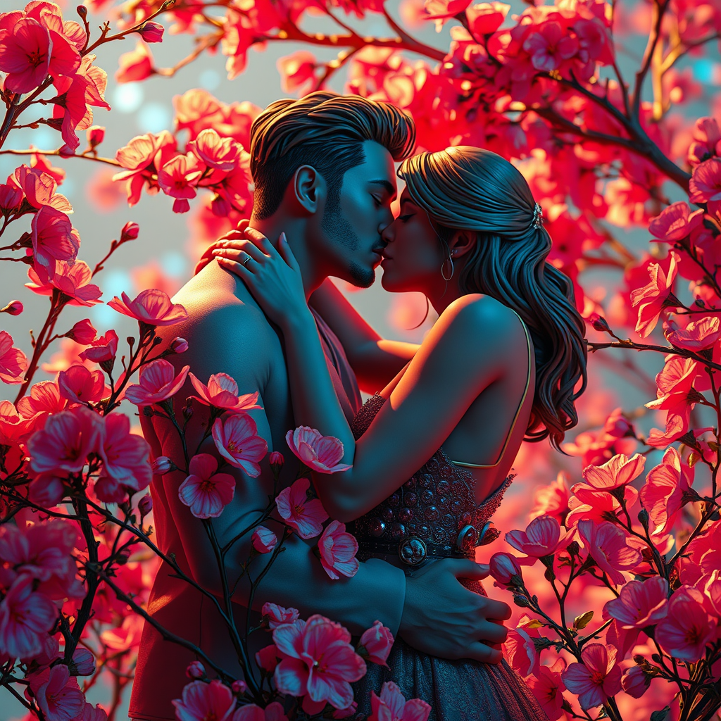 A couple intertwined in an embrace, exchanging kisses amidst blooming pink flowers, all set against a backdrop of cyberpunk futurism. The scene glimmers with strokes of gold and flashes of azure, crafted with the precision of ZBrush, giving life to fantastical and otherworldly creatures that dance in the periphery. Their expressions and details echo the delicate artistry of portrait miniatures, inspiring awe and disbelief at the beauty unveiled. The color palette weaves through hues of dark cyan and red, casting a mesmerizing glow over the surreal landscape, and transforming the moment into an ethereal fusion of love and futurism.