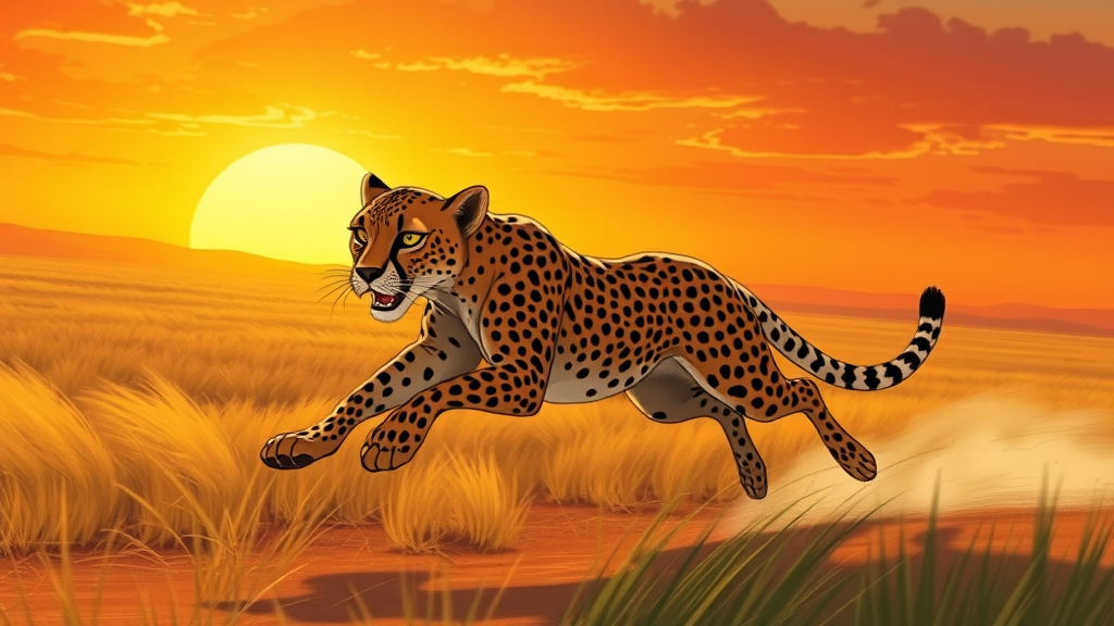 A courageous cheetah dashes across the open savanna, its streamlined form glistening under the setting sun, capturing the essence of movement and speed. The vibrant hues of the sunset cast long shadows, enhancing the drama of the scene. Pixar Animation Studios influences the style with its attention to detail and vivid colors, while Art Spiegelman's touch adds a touch of whimsy and depth. The cheetah's focused expression embodies determination and grace, merging raw nature with dynamic artistry.
