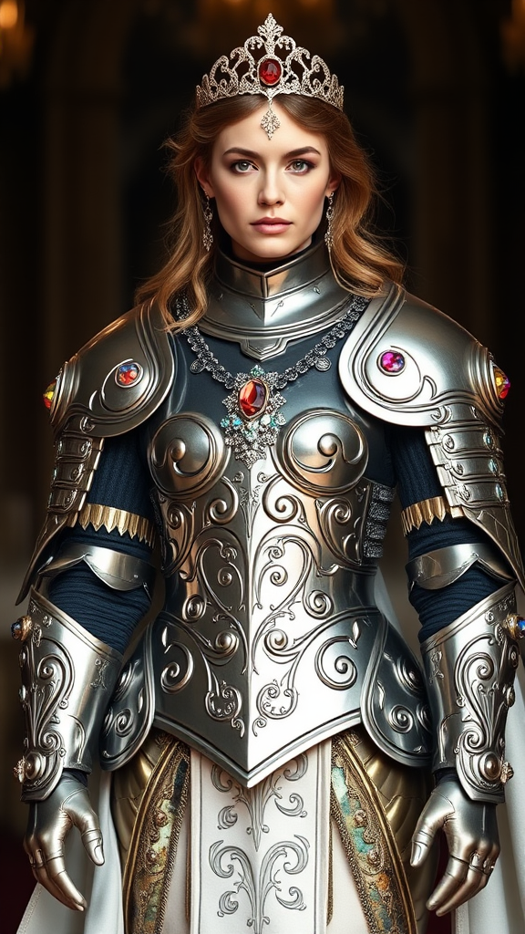 A courageous Princess stands proudly in a magnificent suit of armor, expertly crafted to be both exquisite and combat-ready. The armor is forged from gleaming polished steel, with delicate swirling patterns engraved across its surface. It sparkles with a dazzling array of colorful gemstones that catch the light. The armor is tailored to her form, highlighting her silhouette while ensuring comprehensive protection in battle. The entire ensemble strikes a perfect balance between elegance and strength.