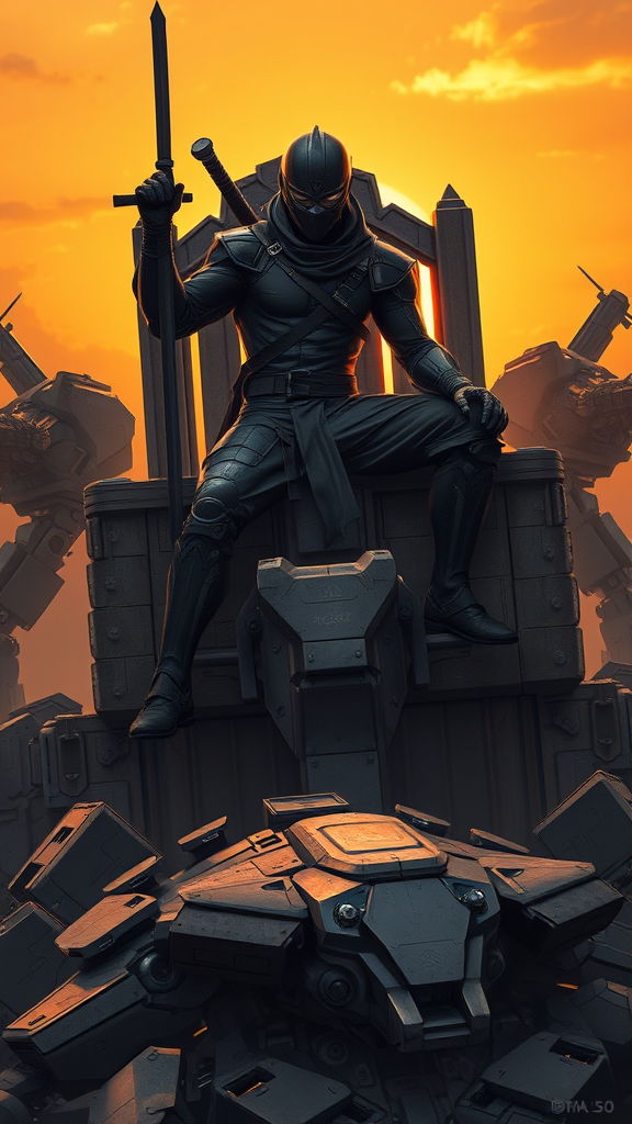 A courageous warrior clad in a sophisticated futuristic black ninja suit sits defiantly atop a throne fashioned from the remains of defeated robotic adversaries, his physique impeccably proportioned. The style is reminiscent of Soviet-era posters, infused with a flair of USSR propaganda art. In the backdrop, the remnants of a ravaged mech lie sprawled, illuminated by the subtle, golden hues of dawn. The scene is depicted in a vivid anime and manga graphic style, utilizing dark, intense colors to convey mood. The offset printing technique adds depth and texture, while the entire composition is presented in high detail, capturing an epic, cinematic essence. An 8K, HD, CMYK masterpiece showcasing heroic triumph amid a high-tech dystopian landscape.
