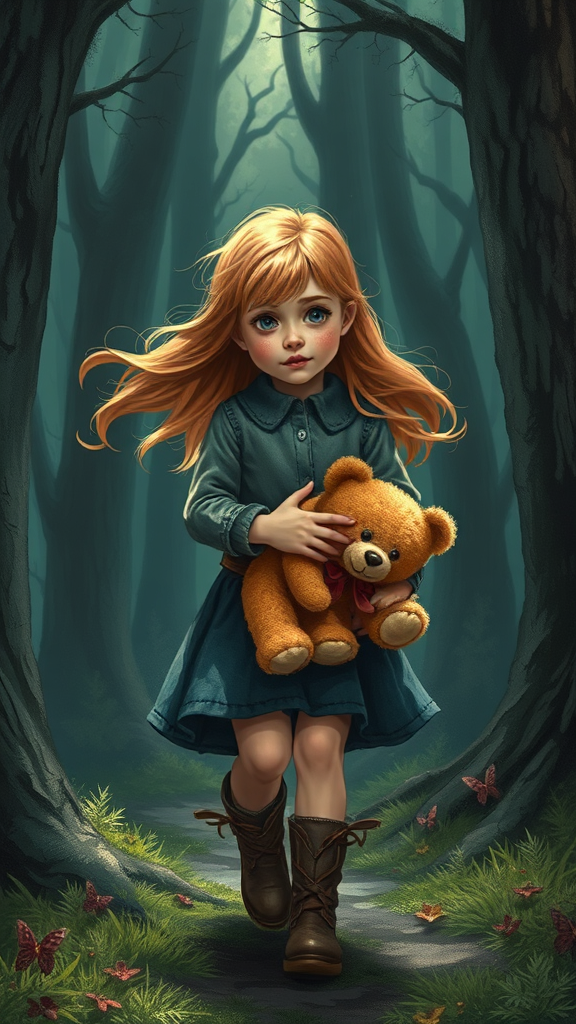 A courageous young girl with flowing strawberry-blonde hair steps cautiously into a shadowy, enchanted forest, clutching a pair of beloved, well-worn teddy bears tightly to her chest.