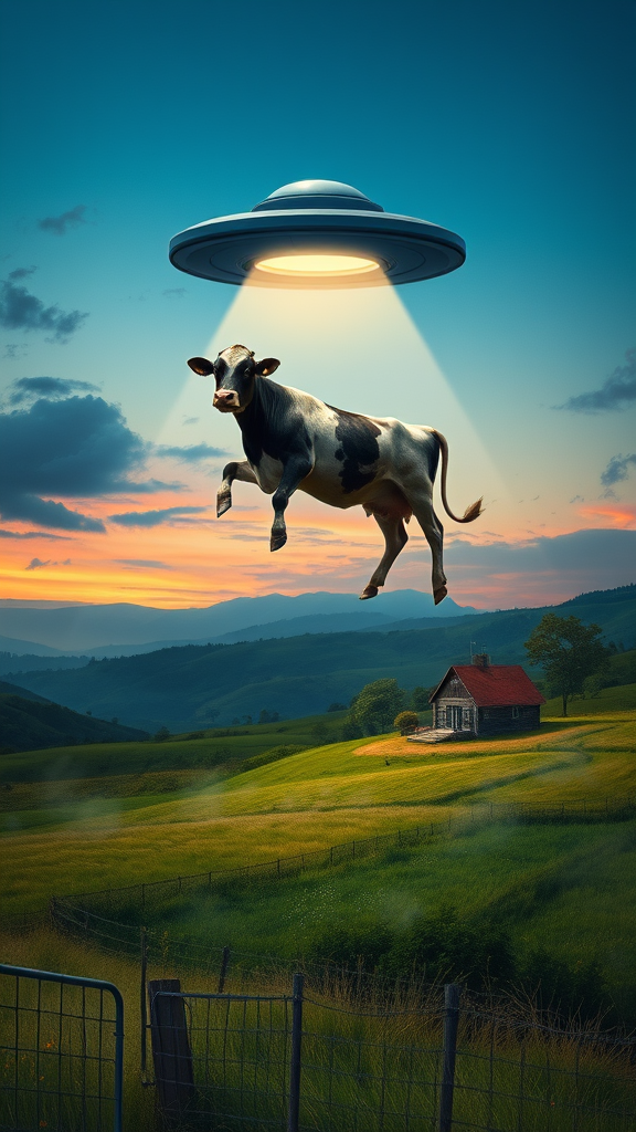A cow levitates gracefully in a shimmering beam beneath a sleek UFO, illuminated against the twilight sky, casting a serene glow over the pastoral landscape. Nearby, a rustic farmhouse nestles amidst rolling hills and whispering fields, embraced by the soft hues of dusk. Ethereal mist weaves through this dreamlike scene, infusing it with a tranquil, almost otherworldly quality, reminiscent of a zen oasis. The landscape unfolds with the bold vibrancy of Die Brücke’s expressionism, merging with surreal, fantastical elements that blur reality and dreams, inviting contemplation and wonder in this moment of surreal beauty.