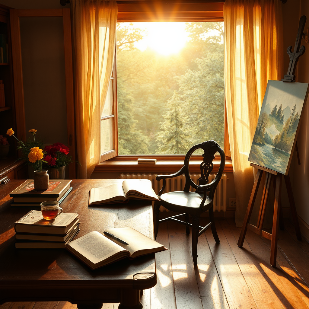 A cozy 1800s study room bathed in the warm glow of the golden hour, where sun rays gently filter through an open window overlooking a lush forest. Delicate tulle curtains dance in the breeze, casting playful shadows on the aged wooden floor. A sturdy wooden table is accompanied by an elegant chair, both well-worn with time. Textbooks and a notebook lay in organized chaos, alongside a neatly placed pen. A glass cup holds steaming hot tea, its fragrant steam curling into the air. Nearby, vibrant potted flowers add a splash of color to the room. An unfinished watercolor painting rests on an easel, capturing the tranquil beauty of nature outside. The room exudes an old-world charm, brimming with the serene and studious atmosphere of a bygone era.