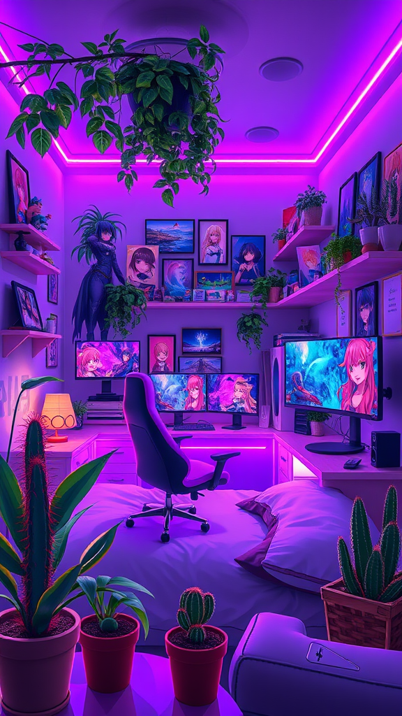 A cozy and charming bedroom exuding anime vibes, softly illuminated by calming purple lights, creating an enchanting night ambiance. Lush green plants and adorable cacti add a touch of nature to the space. The room reflects a gamer otaku's retreat, with shelves lined with anime figurines and posters adorning the walls. The setup is reminiscent of a visual novel background, complete with a comfy gaming chair and dual monitors displaying vibrant anime art. A delicate balance of cuteness and serenity defines this captivating sanctuary.