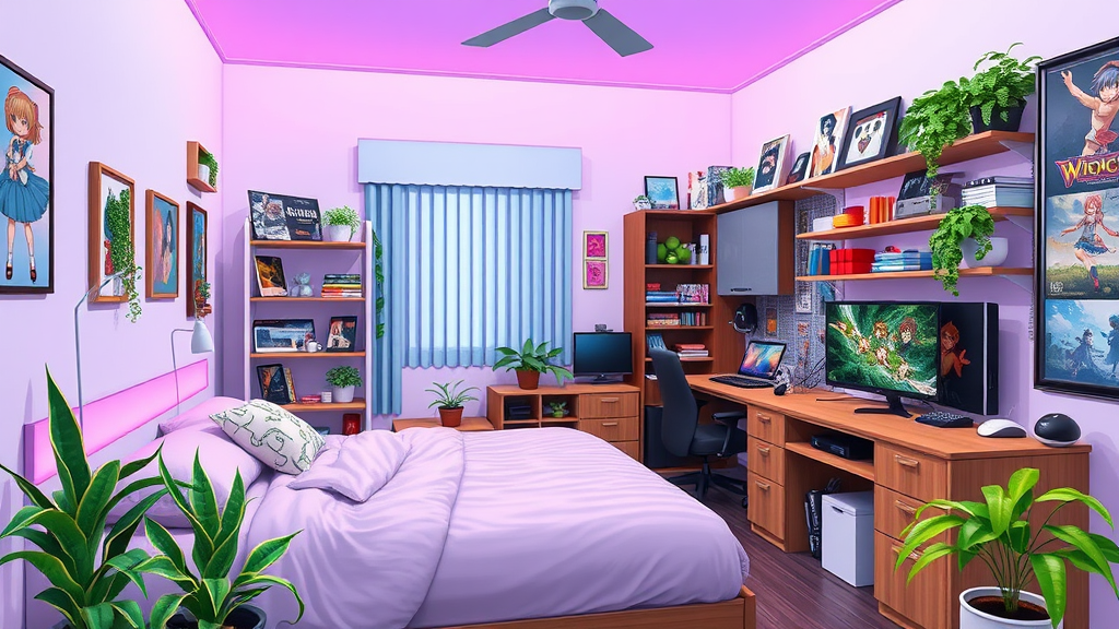 A cozy and charming bedroom with an anime-inspired aesthetic, featuring soft purple lights that create a gentle, dreamy ambiance. The room is adorned with various cute elements and a collection of vibrant green plants, including a single quirky cactus that adds character. This space perfectly blends the passions of a gamer otaku, with shelves holding collectibles and a state-of-the-art gaming setup. The walls are adorned with posters and art from favorite anime and visual novels, completing the immersive experience.