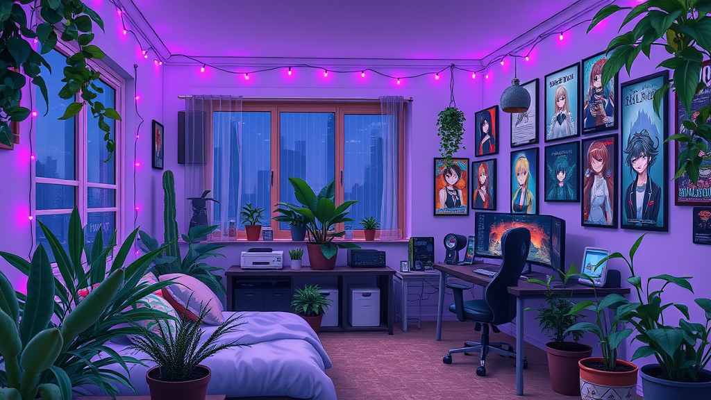 A cozy anime-inspired bedroom at night, adorned with twinkling purple lights that cast a soft glow over the room. The space is filled with lush green plants and quirky cacti, adding to the room's cute aesthetic charm. The setup features a gaming area for a dedicated otaku, complete with posters of favorite anime characters and a high-tech computer setup reminiscent of a visual novel backdrop, blending the serene beauty of nature with the captivating allure of anime culture.