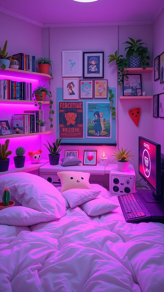 A cozy anime-inspired bedroom at night, featuring an aesthetic blend of cute and vibrant decor. Plush pillows and soft blankets are scattered across the bed, surrounded by thriving potted plants and quirky cacti. Gentle purple lights cast a soothing glow, highlighting shelves lined with manga volumes and colorful figurines. A sleek gaming setup invites with neon accents, perfect for an avid otaku immersed in a gaming world. The glowing screens reflect the virtual charm of a visual novel, enhancing the enchanting atmosphere.