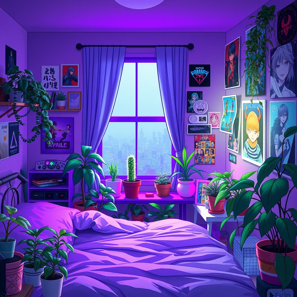 A cozy, anime-inspired bedroom at night, softly illuminated by gentle purple lights that cast a dreamy glow. The room features an array of houseplants, with a single, charming cactus on the windowsill, adding a touch of quirkiness to the serene atmosphere. The space is adorned with gaming and otaku memorabilia, including vibrant posters and collectibles, creating a haven for a gamer enthusiast. The setting resembles a scene from a visual novel, combining a cute and whimsical ambiance with a hint of personal flair.