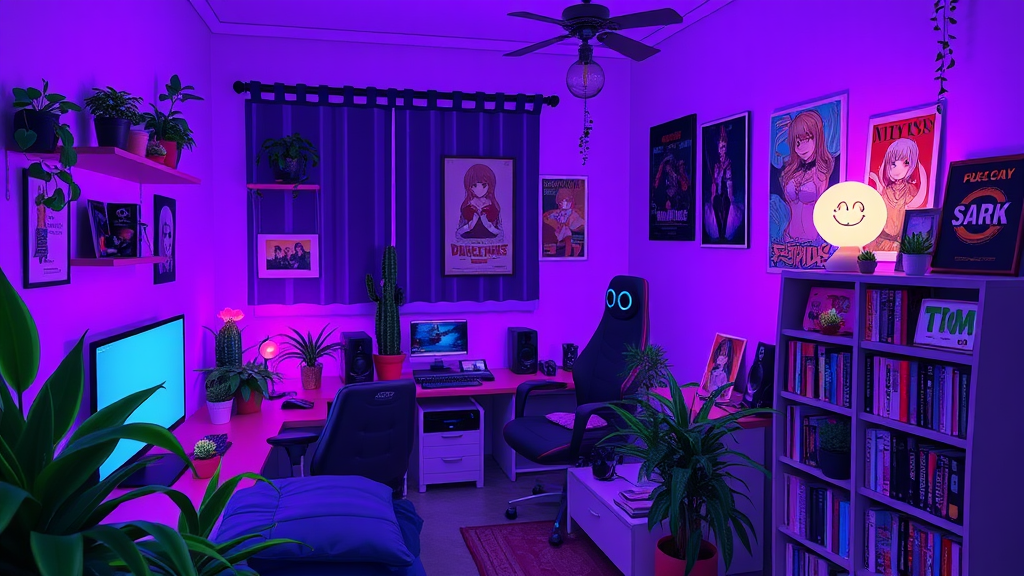 A cozy, anime-inspired bedroom bathed in gentle purple light, creating a serene night-time ambiance. The room is decorated with lush green plants and adorable cacti scattered across shelves and desktops. Gaming and otaku culture influence the decor, with a corner dedicated to a sleek gaming setup featuring glowing monitors. Posters from favorite anime series adorn the walls, while a collection of visual novels is neatly arranged on a nearby bookshelf. The soft illumination casts a magical glow, perfect for unwinding and immersing in another world.