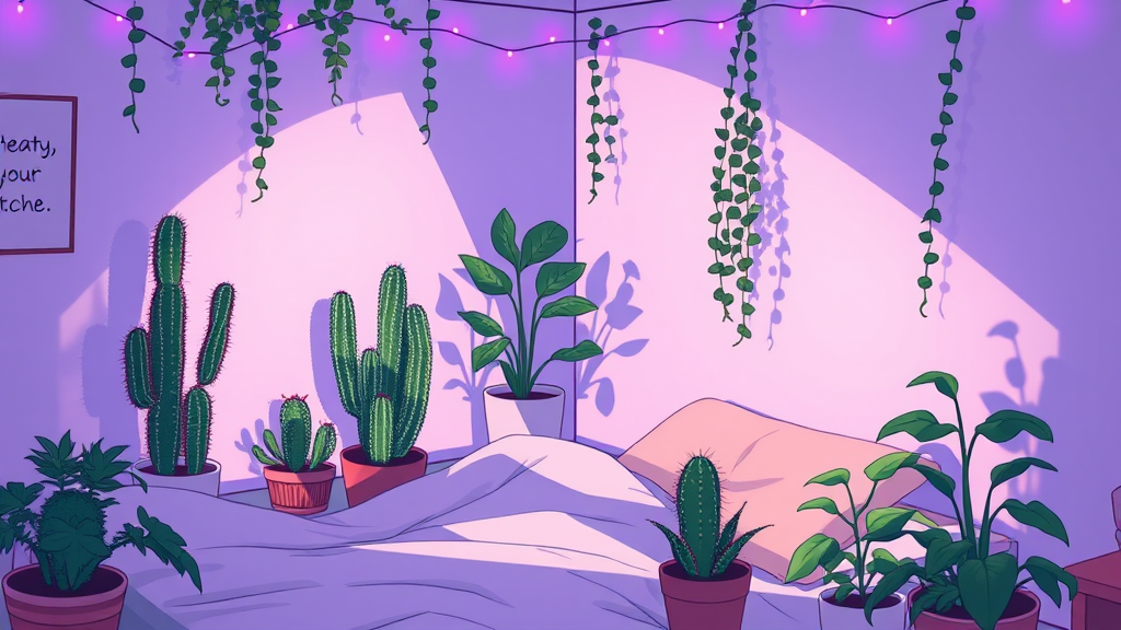 A cozy, anime-inspired bedroom enveloped in the soothing glow of soft purple lights, where cute cacti and lush green plants thrive, casting playful shadows on the walls. Delicate details and pastel hues blend harmoniously to create a dreamy night's sanctuary.